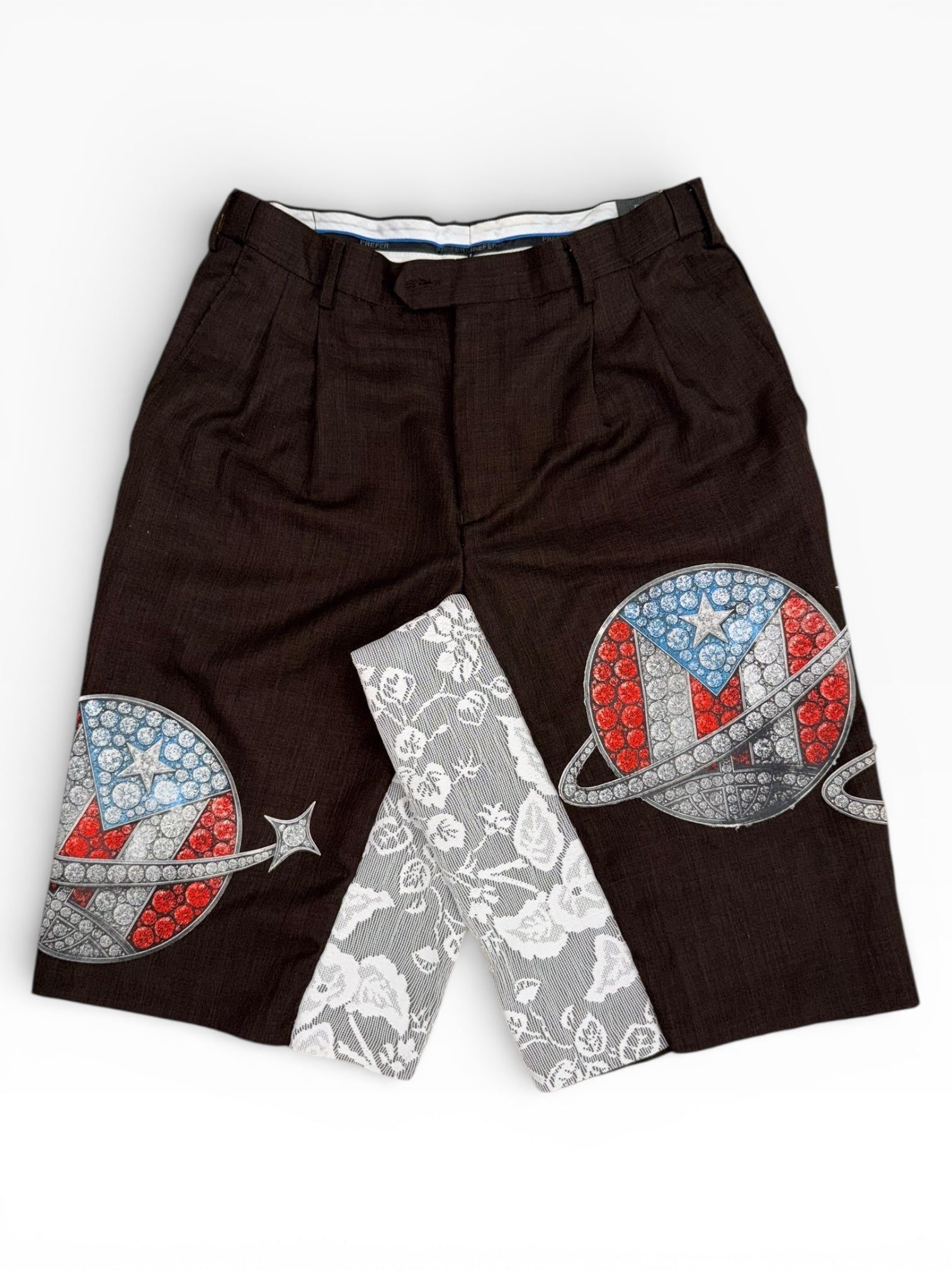 CONSTRUCTED FROM A VINTAGE BASE AND TRANSFORMED WITH CUSTOM APPLIED PATCHWORK AND EMBELLISHED GRAPHIC ELEMENTS, THESE JORTS FEATURE PLANETARY MOTIFS INSPIRED BY PUERTO RICO’S FLAG COLORS, SYMBOLIZING MOVEMENT, EXPANSION, AND DIASPORA. CONTRASTING LACE PANELING ADDS TEXTURE AND SOFTNESS AGAINST THE STRUCTURED FABRIC, CREATING A BALANCE BETWEEN ELEGANCE AND STREET EXPRESSION.